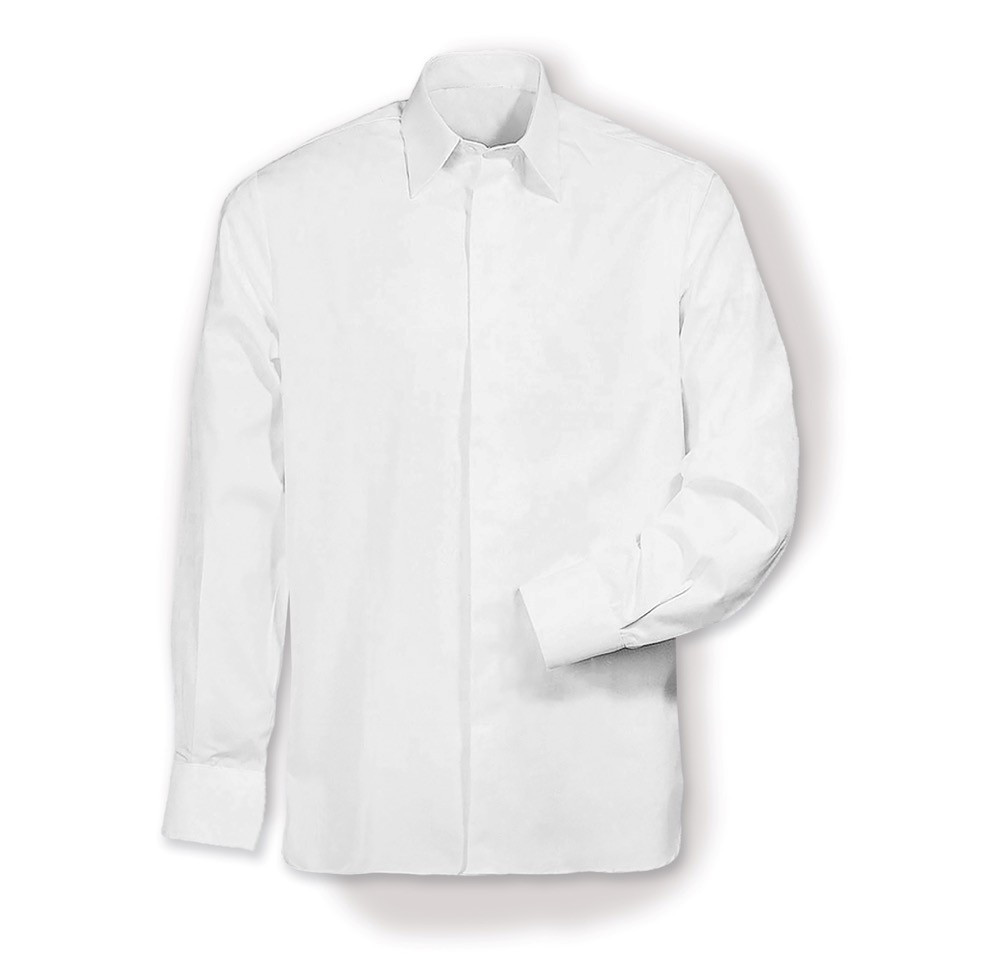 Chemise de ville dotée d’un col classique monté sur pied de col. Fermeture frontale sur toute la hauteur par un boutonnage dissimulé sous patte. Boutons assortis à la teinte du tissu.