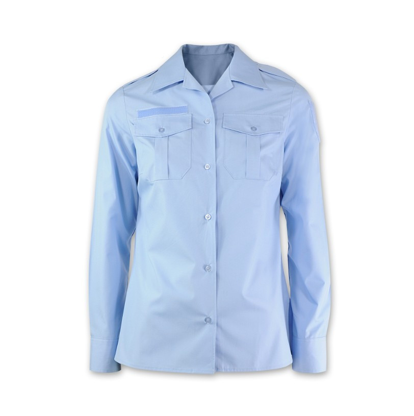• Manches terminées par un poignet simple aux angles arrondis et fermé par bouton.