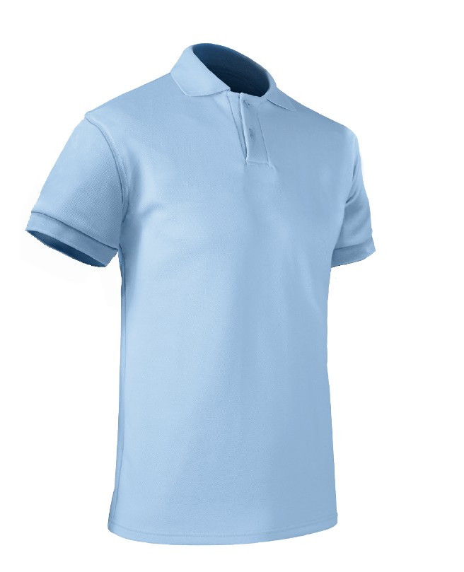 De forme classique, le polo manches courtes est de couleur bleu clair, il est réalisé en piqué coton/polyester,